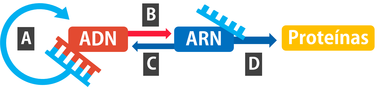 En 1970, Francis Crick enunció el Dogma Central de la Biología Molecular que está representado esquemáticamente en la figura superior. Identifica como se llama cada uno de los procesos señalados con las letras A, B, C, y D.